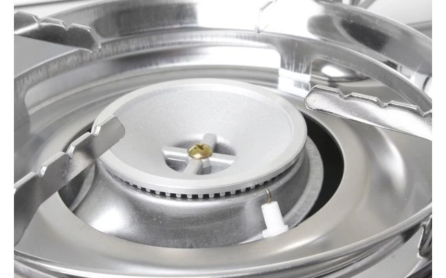 Zweiflammiger Gaskocher mit Aluguss-Grillplatte, integrierter Piezozündung und zwei Aluminium-Brennern. Gaszufuhr regelbar. Ohne Zündsicherung.