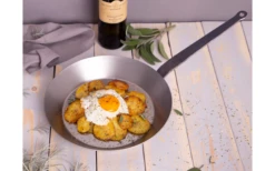 Mit dieser Pfanne werden Sie viele Jahre Spaß haben. Aus Großmutters Küche kennen wir noch diese guten Eisentöpfe und –pfannen. Neben ihrem rustikalen Aussehen zeichnen sie sich insbesondere durch hervorragende Brateigenschaften aus. Speisen, die darin zubereitet werden, behalten ihren natürlichen, unverfälschten Eigengeschmack. Die Pfanne ist ideal für alles, was scharf an- und evtl. durchgebraten wird, z.B. für Steaks, Schnitzel, Bratenstücke, Röstkartoffeln usw.. Sie können sie auch nutzen, um Tellergerichte direkt zu servieren. Die Pfanne ist für folgende Herdarten geeignet: