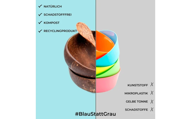 - Nachhaltiges Naturprodukt: Das Set beinhaltet jeweils zwei Kokosnussschalen, Löffel und Schüsselhalter. Die Schalen bestehen aus recycelten Kokosnüssen, die in der Kokosmilchindustrie übrig bleiben. Ein echtes Naturprodukt aus 100 % Kokosnuss – lebensmittelecht, geschmacksneutral, vegan und kompostierbar.