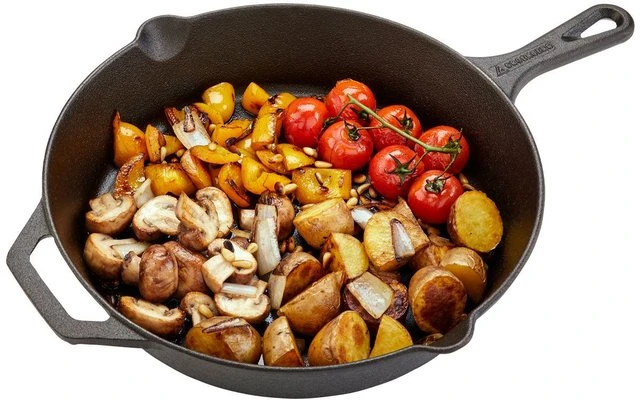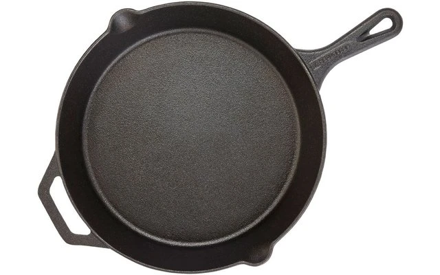 Gusseiserne Pfanne für leckeres Braten und Schmoren. Die gleichmäßige Wärmeverteilung sorgt für optimale Ergebnisse – auch ohne Grill, direkt über dem Feuer. Kurzgebratenes wird außen knusprig und bleibt innen saftig, Gemüse bleibt knackig und behält seine Nährstoffe und Bratkartoffeln werden kross und schmackhaft. Mit den praktischen Ausgüssen an beiden Seiten lassen sich Flüssigkeiten und Soßen ganz einfach und genau dosiert abgießen. Geeignet für Grill, Gasherd, Backofen oder offenes Feuer.