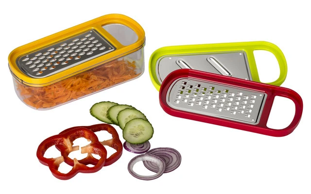 Praktische Reibebox mit 3 verschiedenen, rostfreien Aufsätzen. Stapelbar.