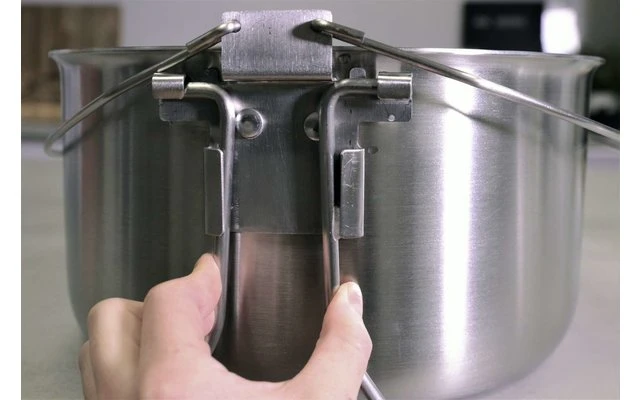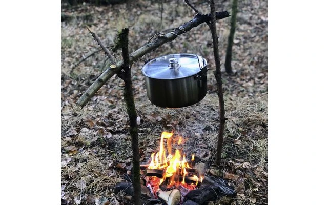 Die zwei außerhalb des Schwerpunktes angebrachten Henkel bieten beim Tragen und am Dreibein sicheren Halt. Ausgerüstet mit den mitgelieferten Standbeinen kann der Topf über einen Kocher oder ein Feuer gestellt werden.