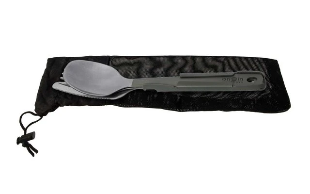 ehr leichtes und stabiles 4-teiliges Besteckset aus rostfreiem Titan. Das Besteckset lässt sich schnell und einfach kompakt zusammenzustecken und an den Ringöffnungen zum Beispiel mit einem Karabiner am Rucksack befestigen.