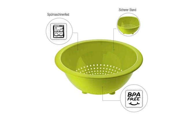 Das Sieb Caruba besitzt einen Durchmesser von 24.5 cm. Es ist aus robustem, pflegeleichtem Kunststoff gefertigt, der selbstverständlich keinerlei gesundheitlich oder ökologisch bedenkliche Stoffe wie Bisphenol A enthält. Seine schlicht-elegante Form sowie die frische Farbgebung werten das Sieb auch optisch auf. Der praktische Küchenhelfer ist leicht und dennoch stabil – drei Beine sorgen für sicheren Stand, selbst wenn das Sieb mit schweren Gegenständen befüllt ist. Dank des breiten umlaufenden Rands haben Sie auch mit nassen Händen alles fest im Griff. Nach dem Gebrauch können Sie das Sieb einfach in der Spülmaschine reinigen, ohne dass der Kunststoff zerkratzt wird oder sich verformt. Mehrere Exemplare sind bei Nichtgebrauch einfach ineinander stapelbar – das spart Platz im Schrank. Leisten Sie sich einen äusserst langlebigen Küchenhelfer zu einem attraktiven Preis!