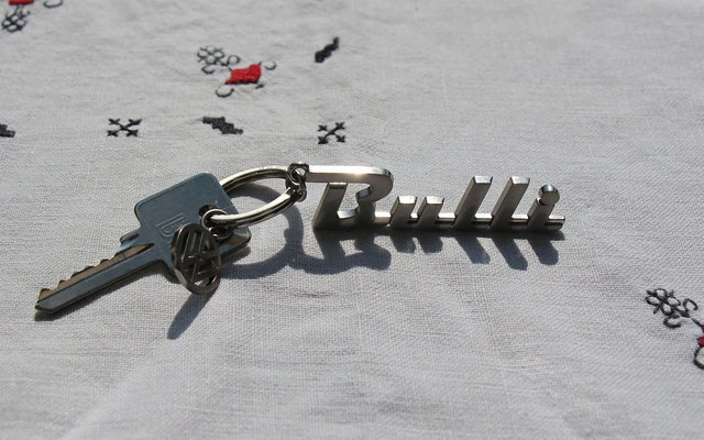 Schlüsselanhänger mit schönem „Bulli“ Schriftzug und kleinem VW Logo Charm am Schlüsselring aus gebürstetem Zink-Aluminium. Das perfekte Geschenk für jeden Bulli Fahrer oder die, die es noch werden wollen.