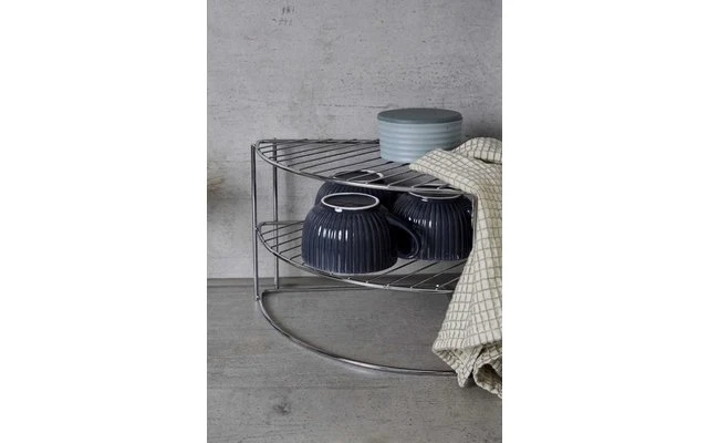 Das exklusive Geschirr-Eckregal fügt sich platzsparend in jede Küchenecke ein. Mit den zwei Ablagen und einer weiteren Ebene bietet das Regal aus Chrom viel Stauraum für Geschirr und Kochutensilien oder kleinere Küchengeräte. Auch Lebensmittel können griffbereit auf dem praktischen Regal verstaut werden. Das macht das Geschirreckregal zu einem nützlichen Helfer in jedem Haushalt.