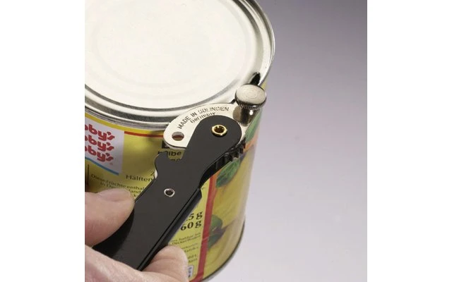 Praktischer Hebel-Dosenöffner zum Öffnen von runden und eckigen Konservendosen, inkl. Kapselheber zum Öffnen von Flaschen mit Kronkorken.